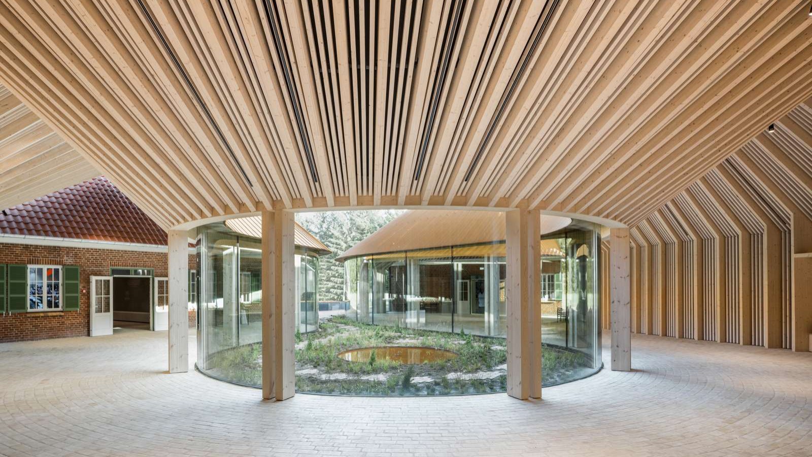 Velká okna otevírají pohled na vnitřní dvůr a les, ve kterém kdysi stávaly ubytovny pro uprchlíky. V nové budově je kromě foyer, šatny, muzejní prodejny a pokladny také sociální zařízení. Splachovací nádržky a zásobovací systém Mapress dodal Geberit.